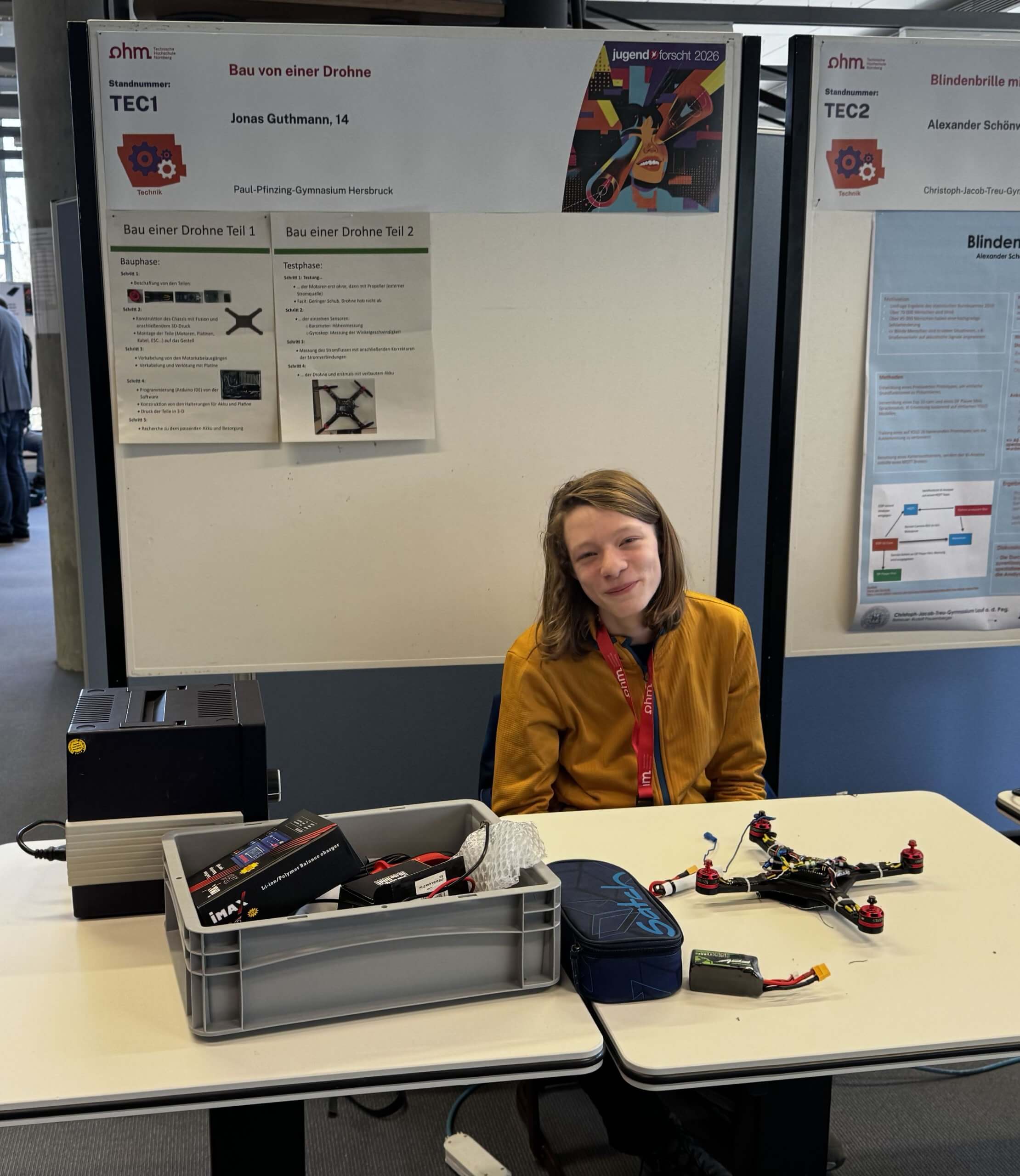 Jonas Guthmann verfolgte eine ebenso praktische wie anspruchsvolle Fragestellung: Wie baut man aus alten, defekten Bauteilen eine funktionsfähige Drohne? In seiner Arbeit „Bau von einer Drohne“ dokumentierte Jonas den gesamten Prozess — von der Bestandsaufnahme alter Komponenten über Lötarbeiten und Softwarekalibrierung bis zum erfolgreichen Testflug. Selbststudium, Geduld und technisches Geschick führten zu einem funktionierenden Quadrocopter und einem Sonderpreis im Bereich Elektronik, Energie- oder Informationstechnik.