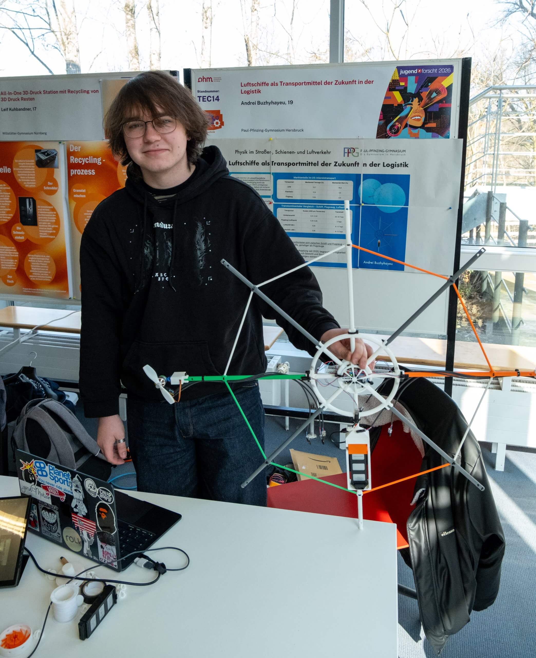 Andrei Buzhyhayeu fragte sich, ob Luftschiffe in der modernen Logistik eine Renaissance erleben könnten. In seiner Arbeit „Luftschiffe als Transportmittel der Zukunft in der Logistik“ analysierte er Transportkosten und Umweltauswirkungen verschiedener Verkehrsträger und konstruierte dazu selbst ein funktionsfähiges Luftschiff-Modell: mit einem 3D-gedruckten PLA-Rahmen, zwei Heliumballons, einem Arduino-Nano-Steuermodul und Brushless-Motoren. Das Ergebnis: Luftschiffe positionieren sich wirtschaftlich zwischen Containerschiff und Flugzeug — günstiger als Flugzeuge, schneller als Schiffe. Die Jury würdigte das Projekt mit dem 3. Preis im Fachbereich Technik.